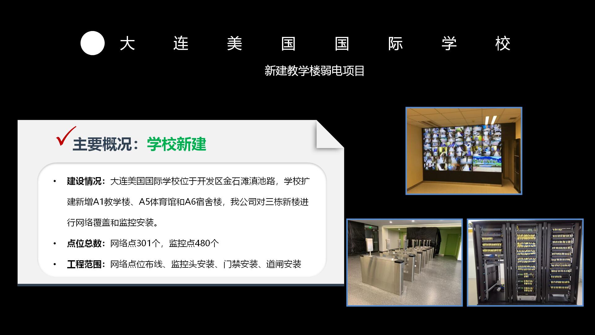 大連美國(guó)國(guó)際學(xué)校新建教學(xué)樓弱電項(xiàng)目。