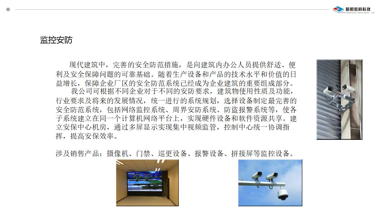 涉及銷售產(chǎn)品:攝像機(jī)、門禁、巡更設(shè)備、報(bào)警設(shè)備、拼接屏等監(jiān)控設(shè)備。